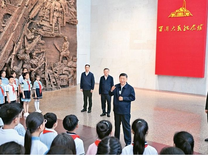 2025年7月7日至8日,中共中央总书记、国家主席、中央军委主席习近平在山西考察。这是7日下午,习近平在位于阳泉市狮脑山的百团大战纪念馆考察时,同前来参观的青少年学生和纪念馆工作人员亲切交流。