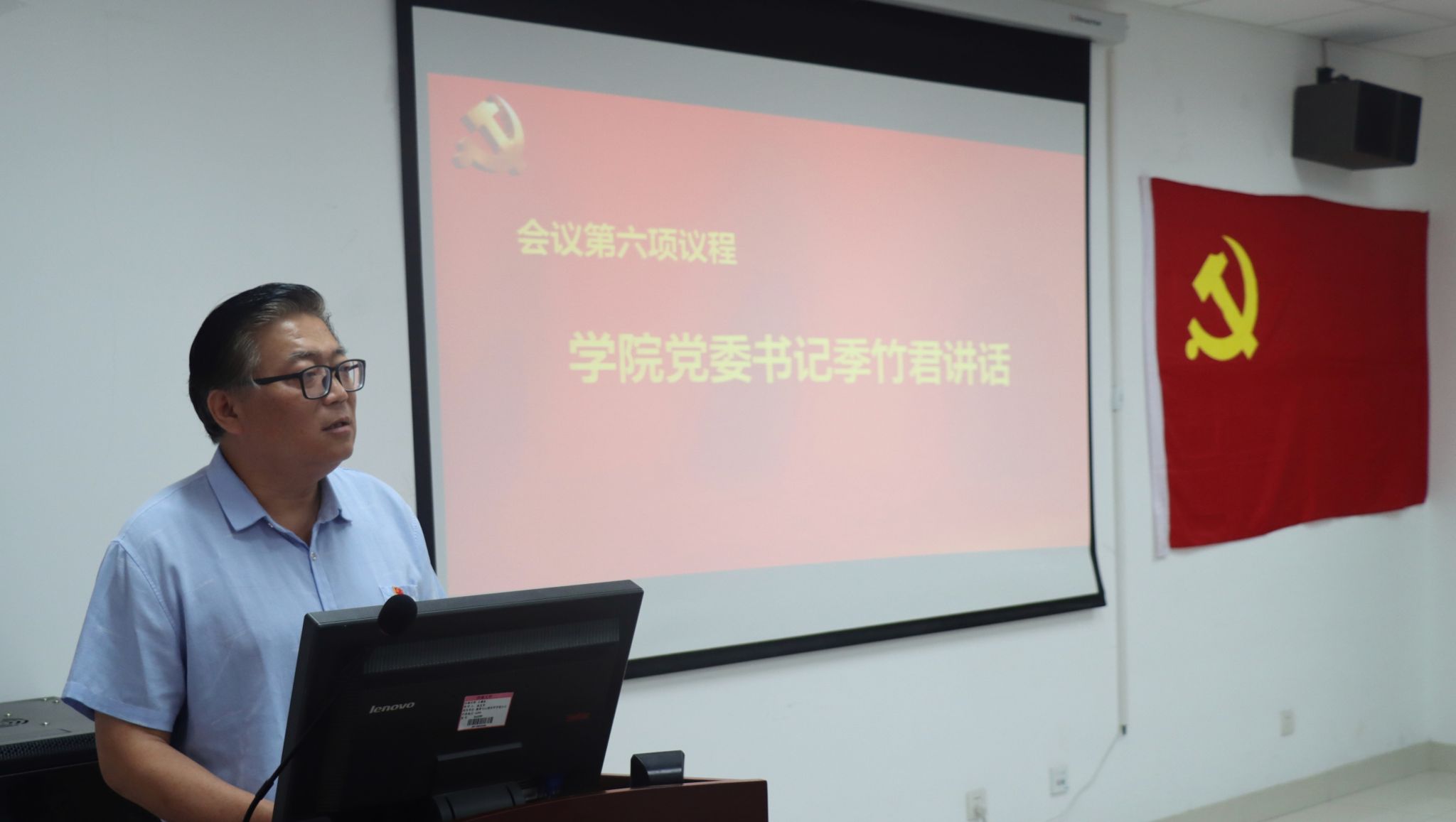 党委书记季竹君代表学院党委向参加宣誓仪式的新党员表示衷心祝贺,并向新党员提出三点要求和希望,一是要坚定理想信念,增强政治定力,锤炼党性修养,履行党员义务,始终保持对党的忠诚;二是要加强学习,不断提高自身素质,积极学习党的历史、理论和路线方针政策,不断提高自己的理论水平和政治素养,始终保持共产党人的浩然正气;三是要投身实践,发挥先锋模范作用,牢固树立正确的共产党员名利观,在工作中要敢于担当责任,始终保持共产党员的先进性。