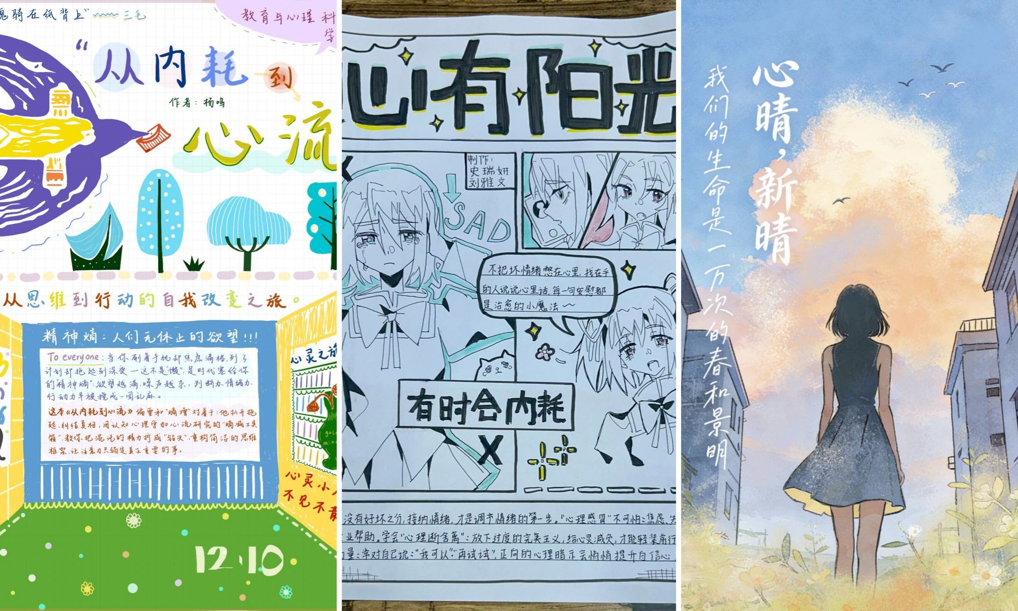 本次大赛以“心理健康与自我成长”为主题,鼓励学生发挥创意,采用漫画、手绘、平面设计等多元形式进行创作。参赛作品充分展现了青年学子在跨学科融合中的创新思维,许多作品巧妙融合文学表达与心理学知识,以富有叙事感的画面、温暖治愈的色调搭配精炼走心的文案,生动呈现了从自我觉察、情绪调节到主动践行积极行动的完整心理成长路径。活动结束后,参赛学生感慨道:“用画笔拆解心理知识的过程,让我更懂如何与自己的情绪相处,也希望能通过作品给同学们带去温暖。”