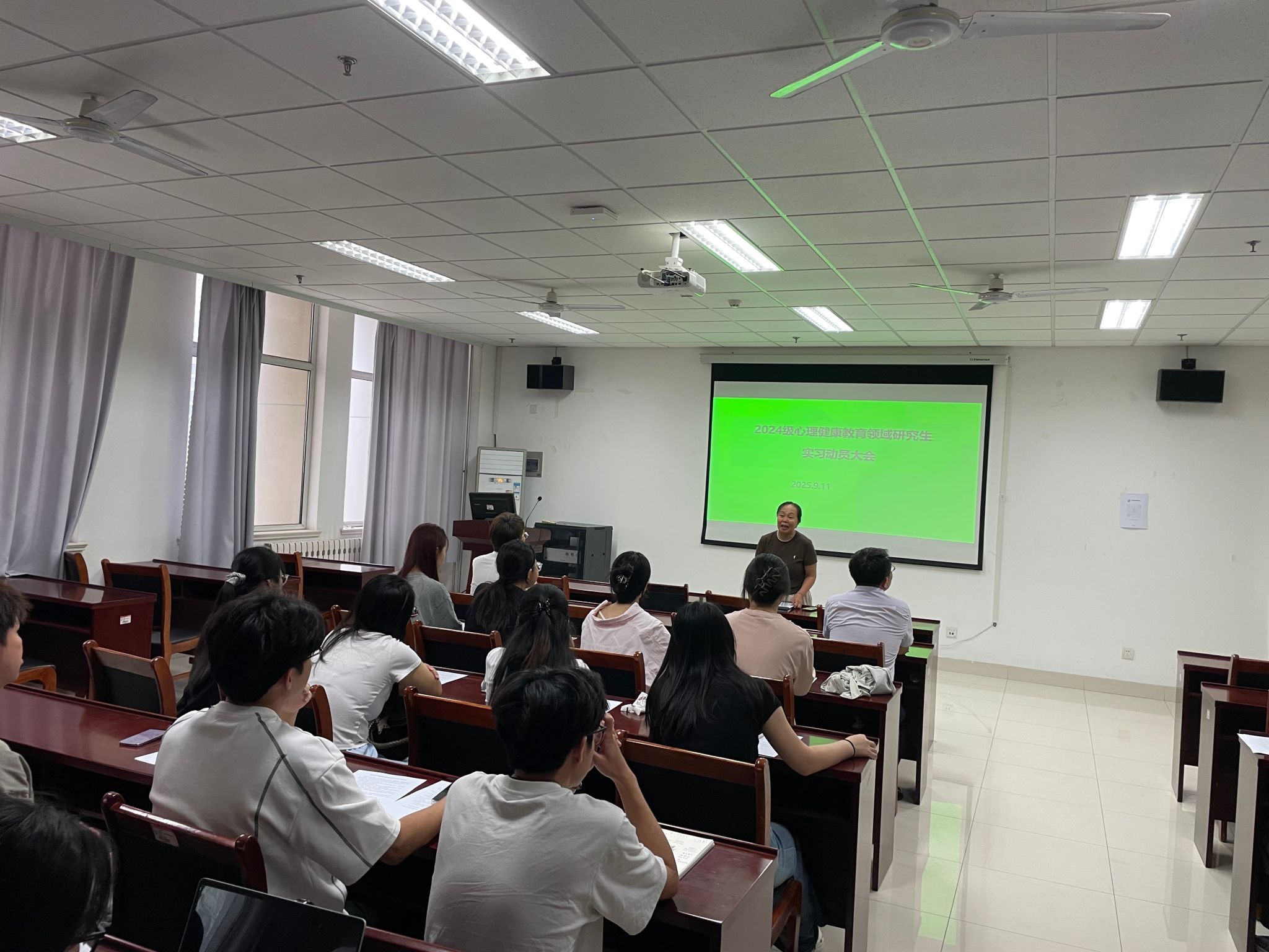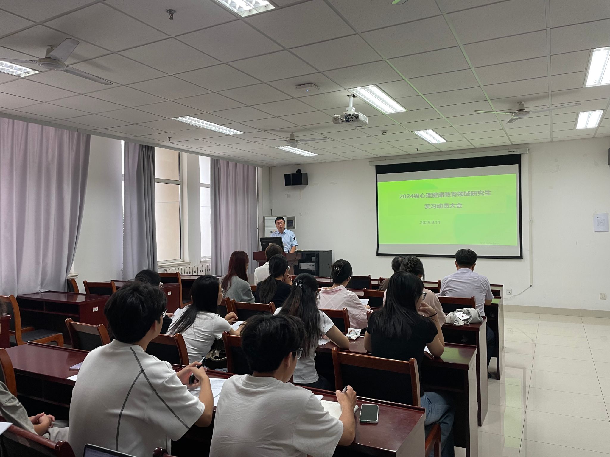 召开了2024级心理健康教育专业学位研究生实习动员大会。本次会议由学院副院长杨鹏主持,教育硕士教育中心主任、心理健康教育专硕负责人魏淑华,教育实习指导教师,2023级研究生代表,2024级心理健康教育全日制专业学位研究生等参加会议。
