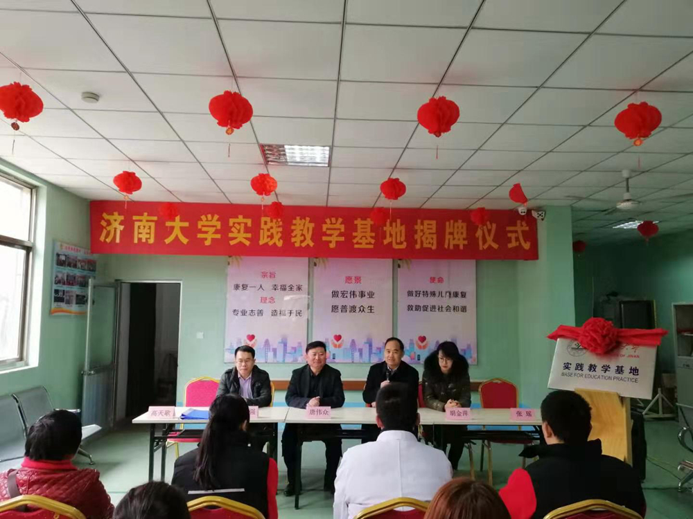 特殊教育专业的发展情况和现状,并以“开心、诚心、爱心”三个关键词展开讲话,鼓励在座教师不断进步学习,做一位有情怀、有温度、有价值的“特教人”,将“特殊教育职业”变为“特殊教育事业”。王教授表示,基层特殊教育学校的师资力量培训应向专业化迈进,但特教教师的责任不应仅停留在“关注儿童康复”阶段,更要在教育的过程中传递教育的价值涵义,让每一位与众不同的孩子都能够成为有价值的人。乔福强主任表示,伟众儿童康复中心丰富的教学实践经验和鲜活案例是高校教学研究极为重要的教学资源,此次合作促进产、学、研相结合,有助于完善学校实践教学体系,增强学生及教师的实践能力、创新能力、科研能力。唐伟众校长表示,济南市市中区伟众儿童康复中心作为山东省首家也是唯一一家针对脑瘫儿童成立的康复学校,中心近年来取得了丰硕的成果,形成了完整的“学习+训练”的引导式教育模式。教师的专业与教育培养是康复中心的短板,期待与济南大学的合作能提高自身师资力量和业务水平,合作共赢,共筑明天。