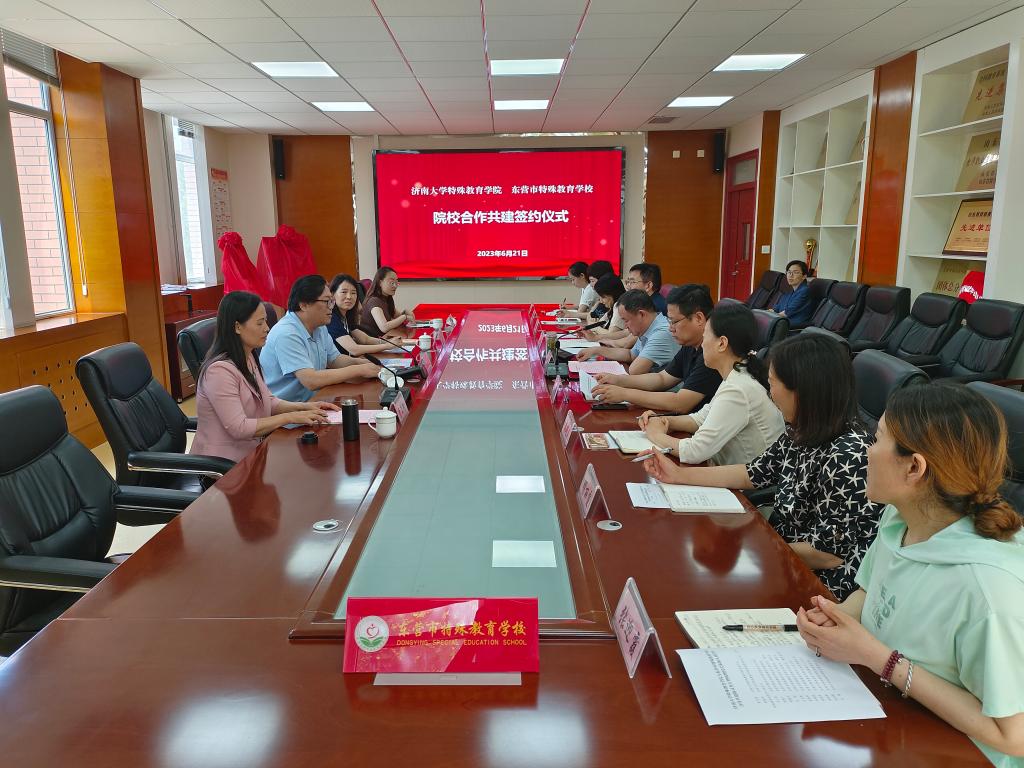 仪式上,济南大学特殊教育系主任宿淑华与黄振东签订合作共建基地协议。季竹君与李玉珍共同为“济南大学本科实践教学基地”“济南大学特殊教育学院课程与教学研究基地”揭牌。