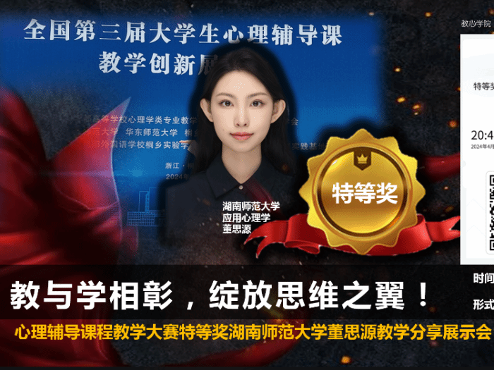 于4月28-29日举办教心学院 “滋兰”育心计划系列讲座 “心理辅导课程教学大赛特等奖、一等奖教学分享展示”活动。