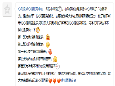 利用学院专业优势,心动泉城心理服务中心志愿者制作出一系列心理测量量表,其中包括焦虑、抑郁、安全感与孤独感等一系列的自测量表,并于3月27日公开收集信息,免费供大学生进行自我测试。电竞比分网