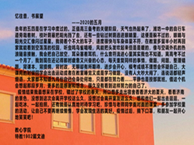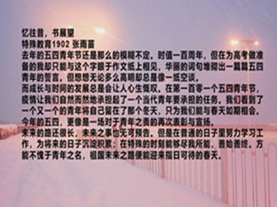 活动期间,参赛者将去年对五四的回忆和今年疫情后的展望用文字表达出来。特教1902班戴文迪同学写到,去年的五四青年节是在备战高考中度过的,虽无聊又疲惫,但是通过“借这个机会想起那段岁月,更多的是感恩和想念,很久没看到这样努力的自己了。”这句话我们能看出,高考前虽然忙碌,但又是充实与满足的一段回忆;特教1902班张雨苗谈到今年五四青年节的特殊,如她所说的“疫情让我们自然而然地承担起了一个当代青年要承担的义务”那样,我们看到了一个又一个青年将自己留在了那个冬天。今年的五四青年节,更像是一场对于青年之责的再次表彰与宣扬。经过作品收集与筛选,电竞比分网