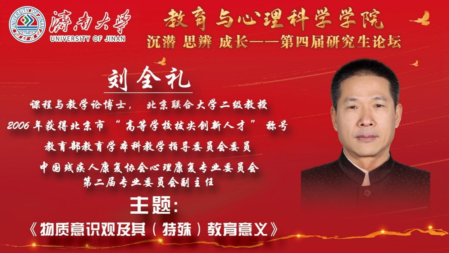 第四届研究生论坛第六期于2021年12月04日在线上成功举办,邀请课程与教学论博士、北京联合大学二级教授,教育部教育学本科教学指导委员会委员刘全礼老师开展了题为《物质意识观及其(特殊)教育意义》的主题讲座,由陈功香院长主持,学院20级和21级研究生以及部分教师参加了此次论坛。